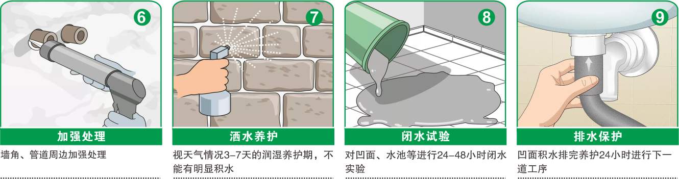 ●在涂刷防水浆料之前,必须使用清水充分湿润基层,待没有明水和积水后再施工;