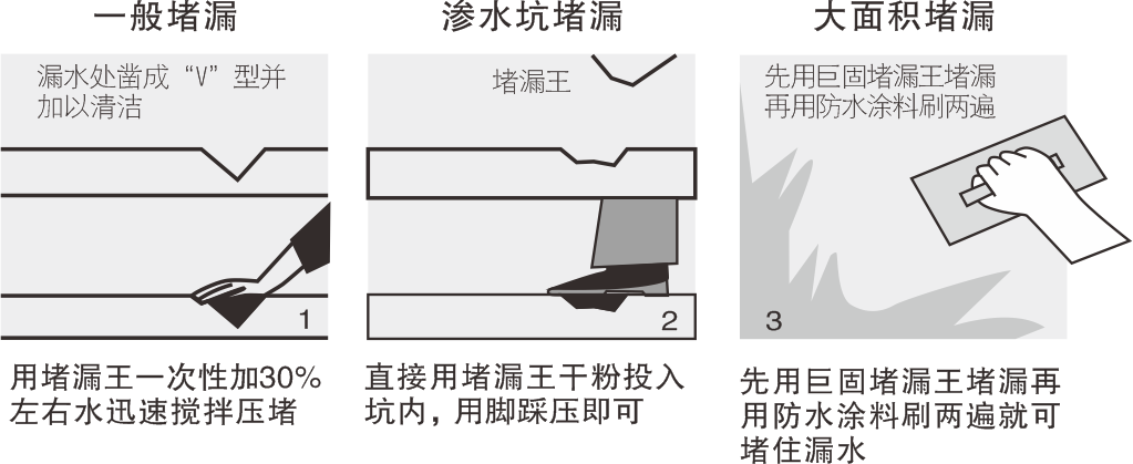 ●将堵漏王加入适量清水,迅速拌和,气温低于10℃时用40℃水搅拌;