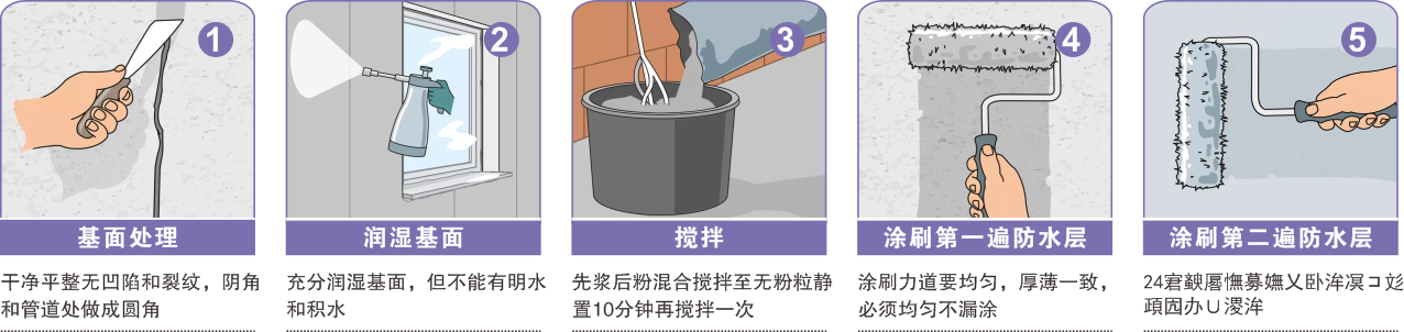 ●在涂刷防水浆料之前,必须使用清水充分湿润基层,待没有明水和积水后再施工;
